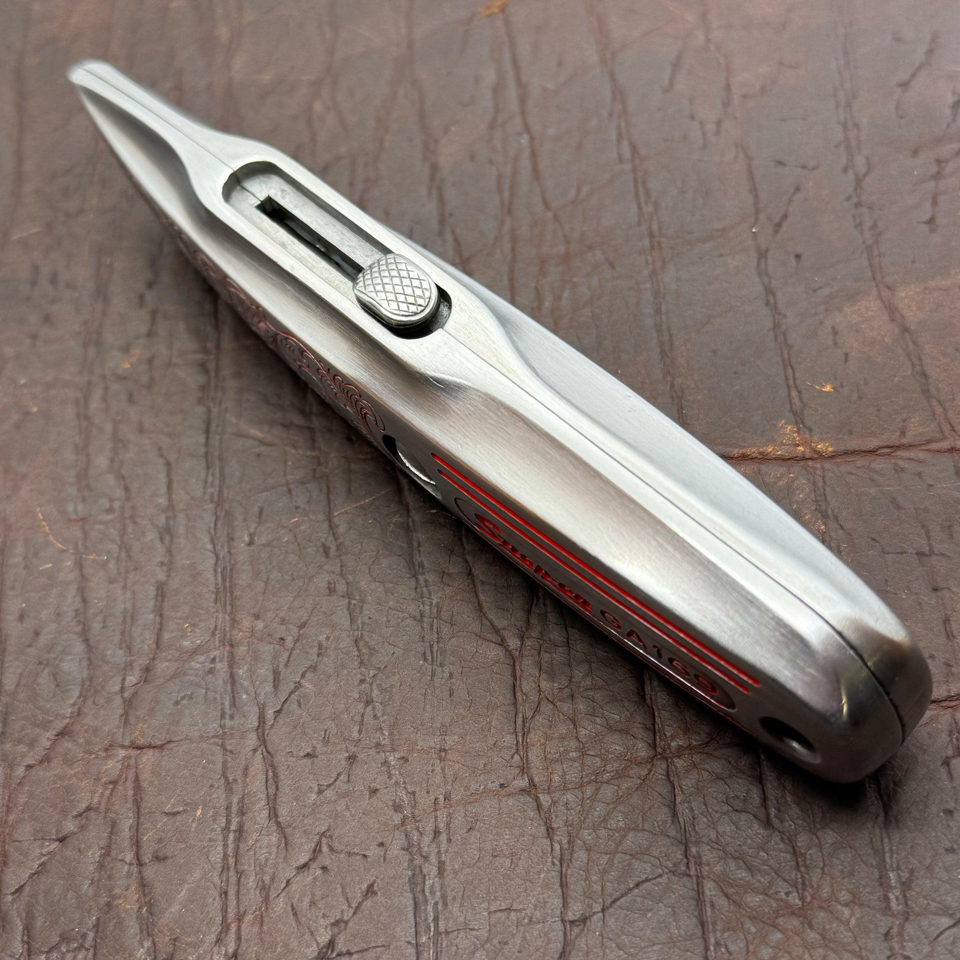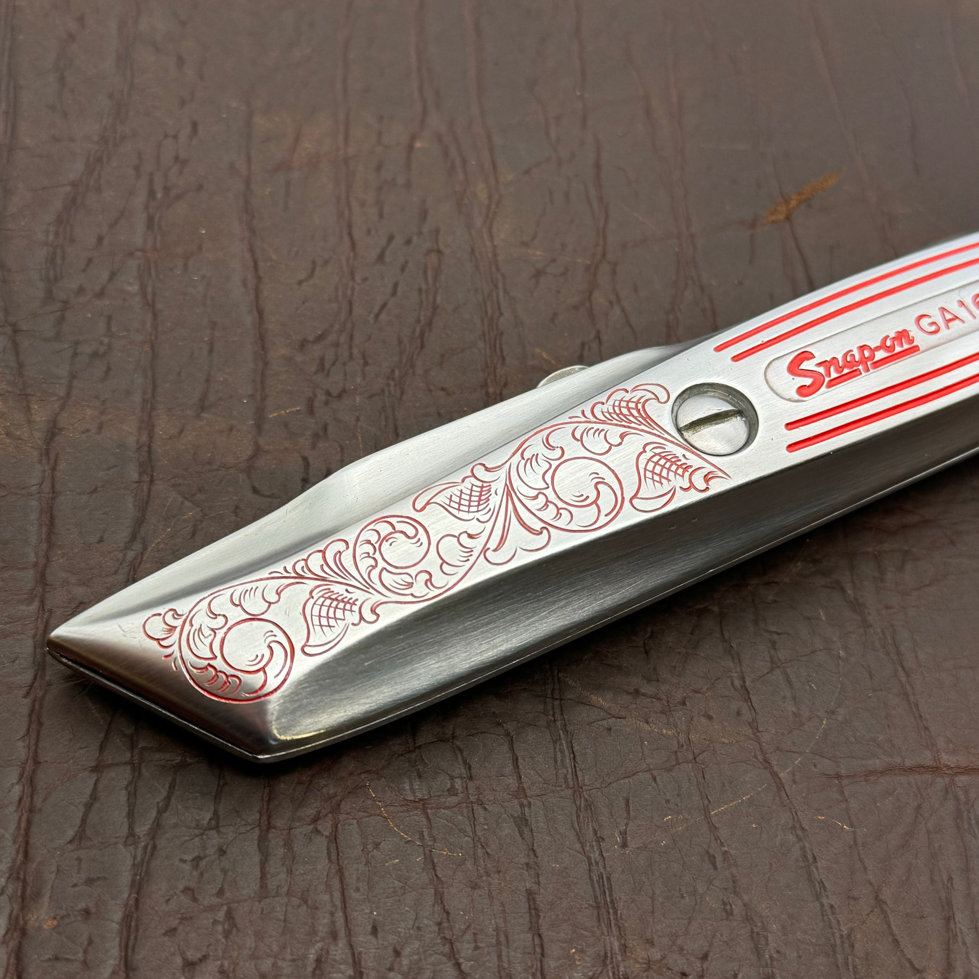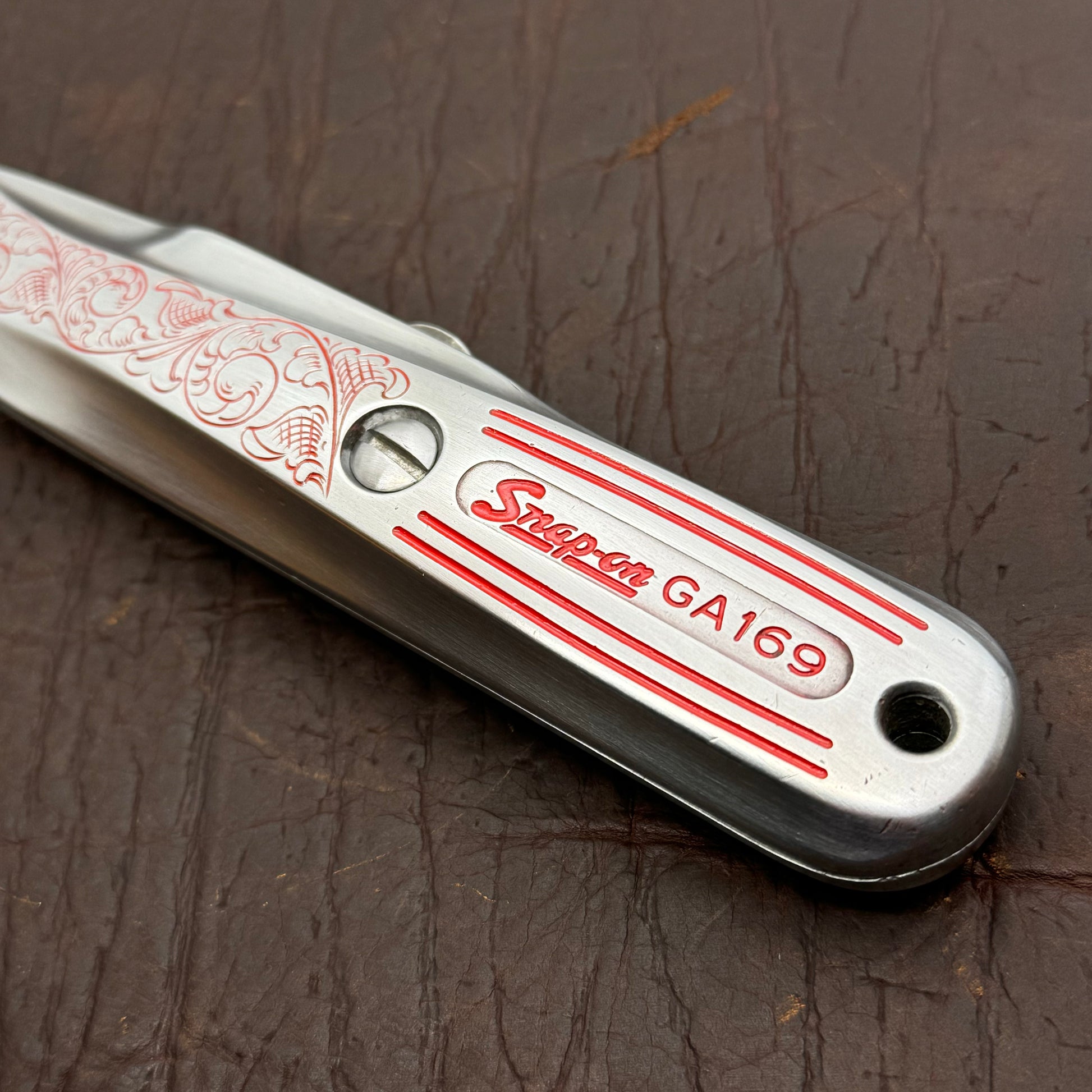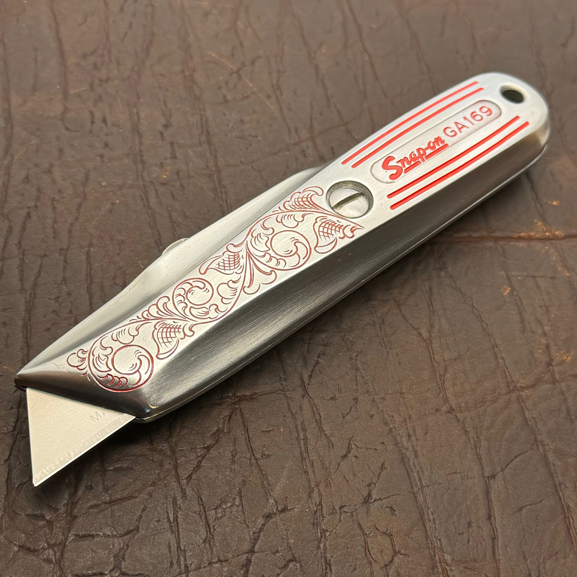 Beautiful Vintage Snap-On GA169 retractable blade Utility Knife, hand engraved by The Tool Engraver (@thetoolengraver on Instagram).