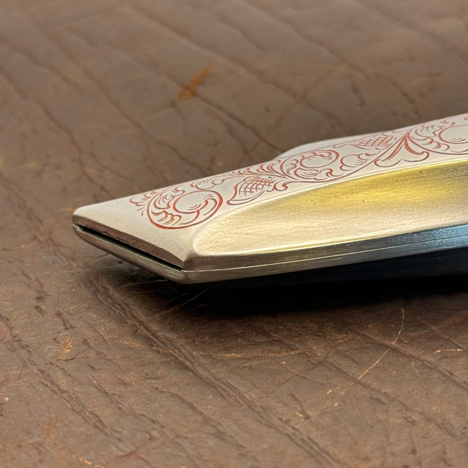 The engraving and handle were colored red to compliment the lightly polished metal frame.