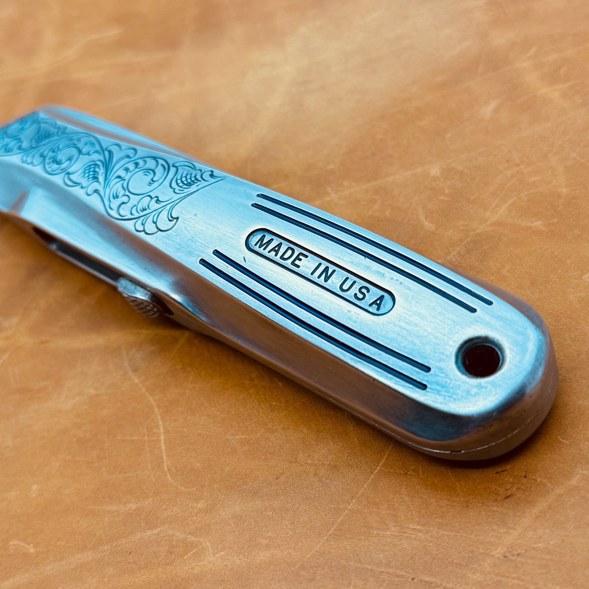 Beautiful Vintage Craftsman 9-9486 retractable blade Utility Knife, hand engraved by The Tool Engraver (@thetoolengraver on Instagram).