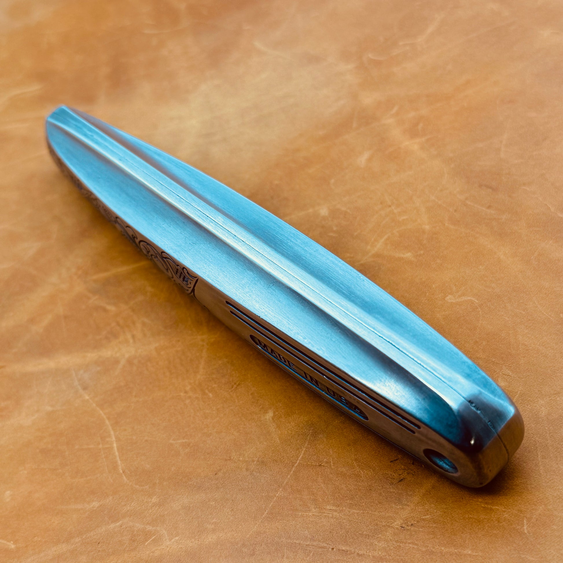 The engraving and handle were colored blue to compliment the lightly polished metal frame.