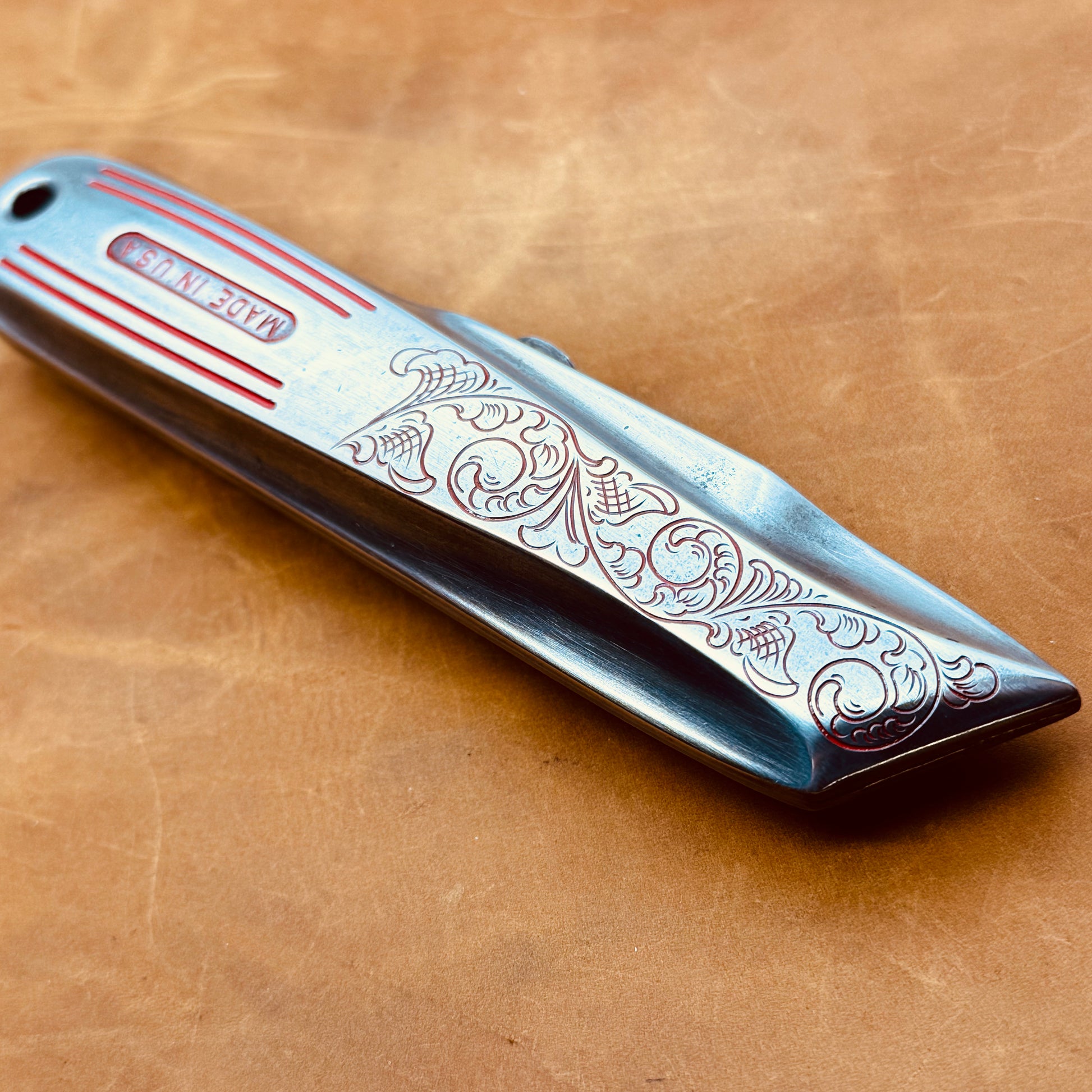 Offered here is a beautiful vintage Craftsman 9-9486 retractable blade utility knife, hand engraved by The Tool Engraver (known on Instagram as @thetoolengraver).