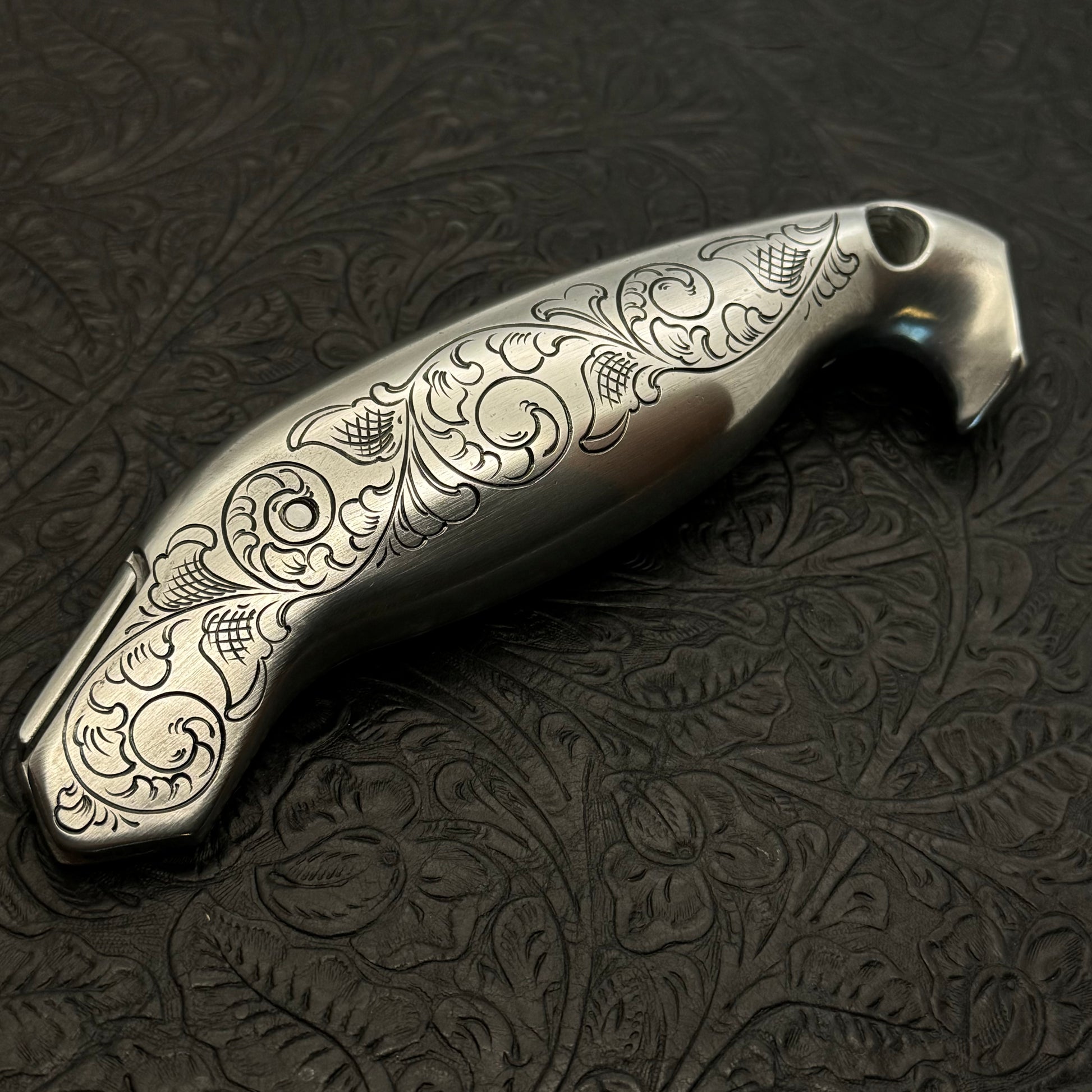 Beautiful Crain 217 Hook Handle Carpet Knife, hand engraved by The Tool Engraver.