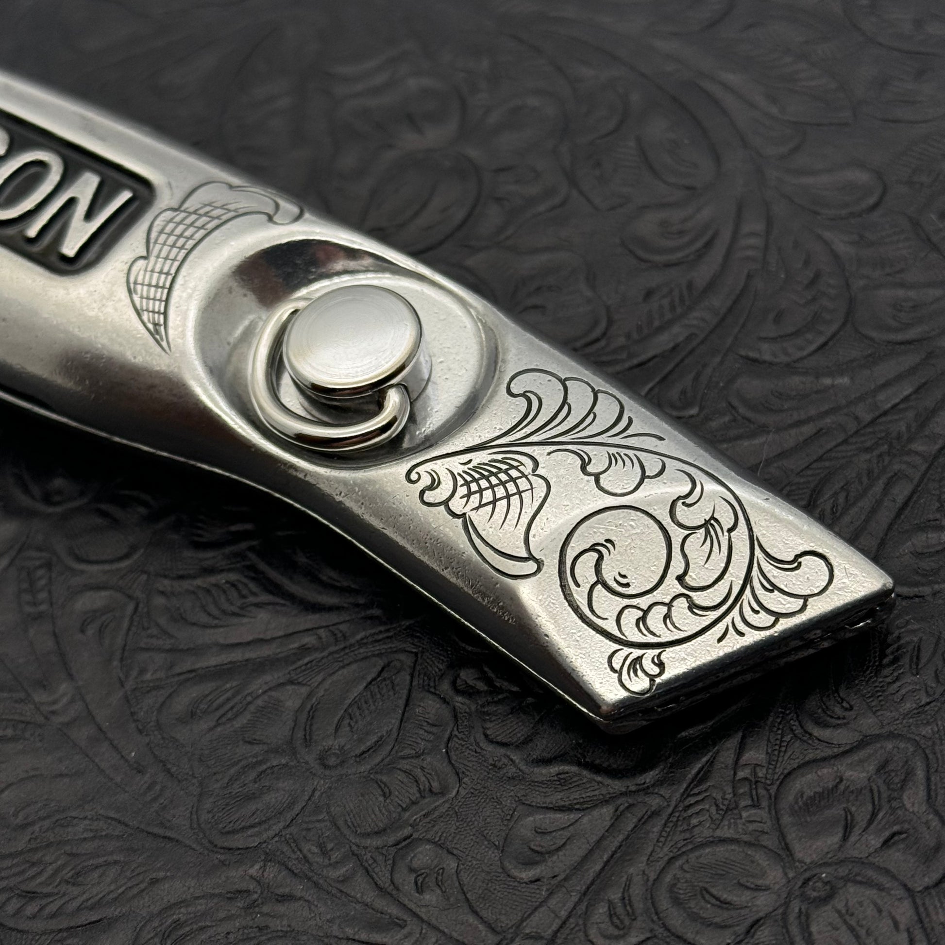 The engraving and handle were colored black to compliment the lightly polished metal frame.