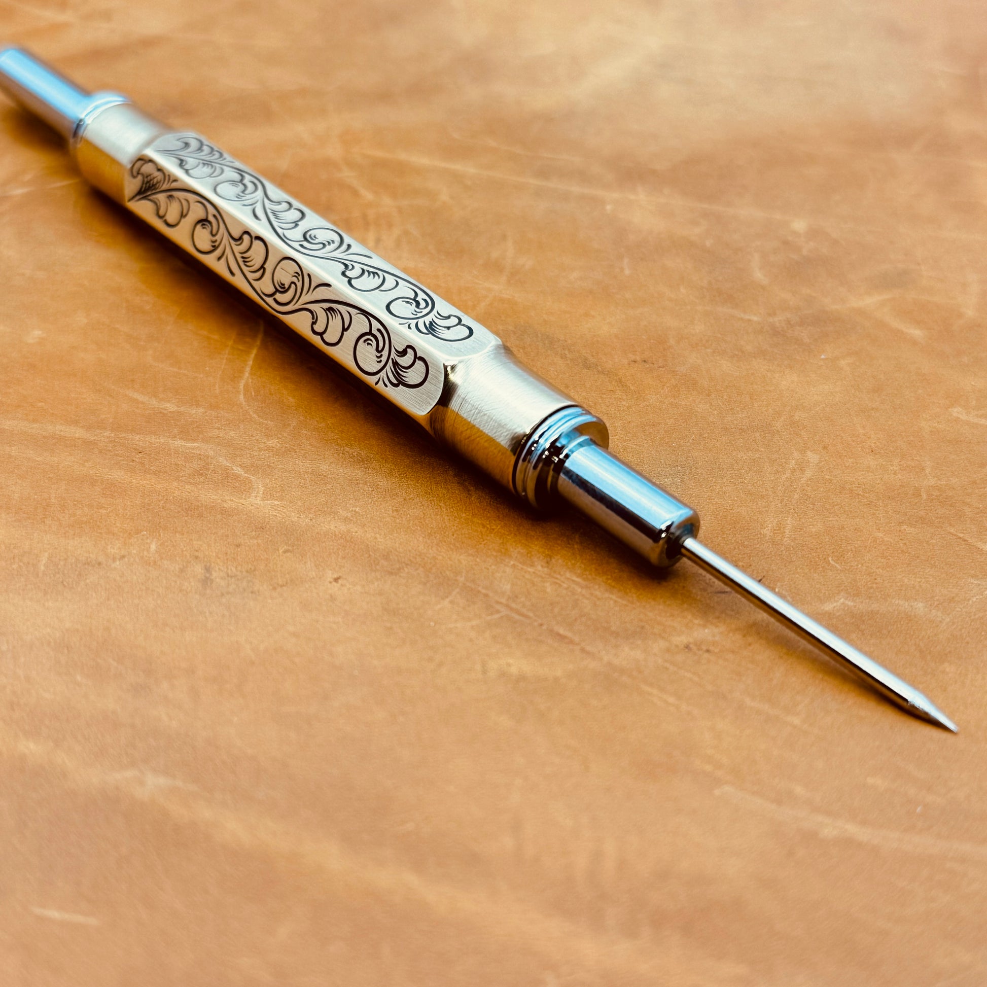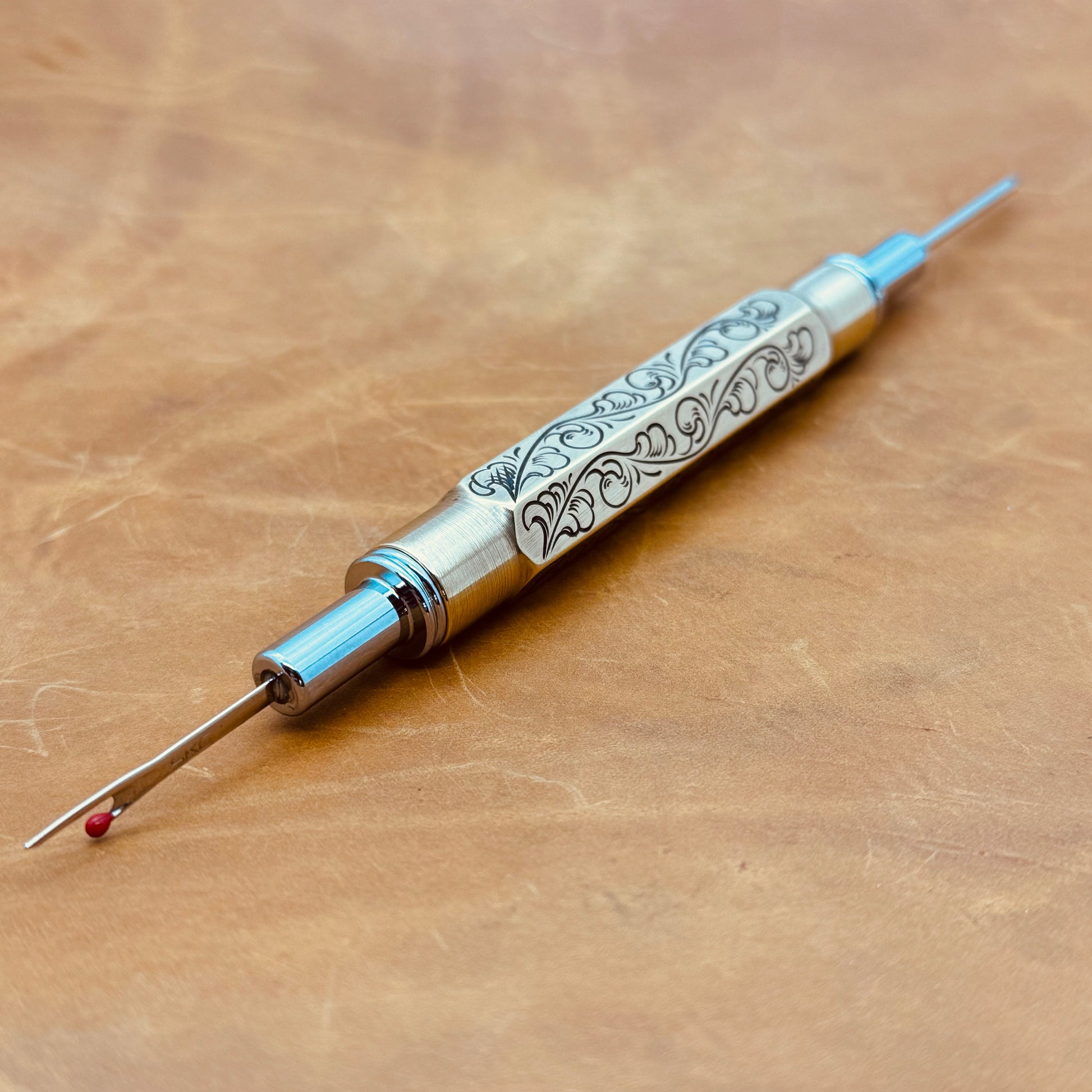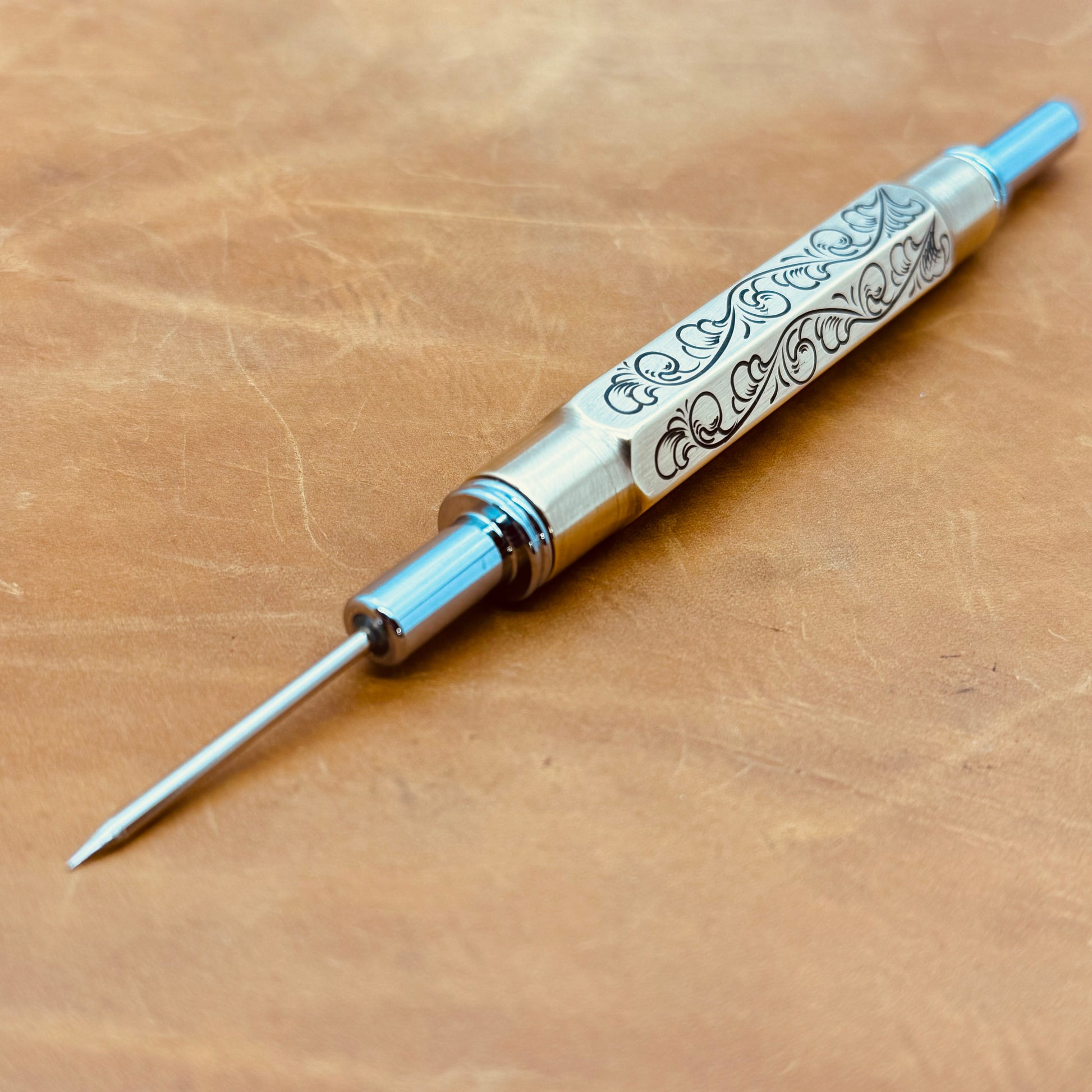 Beautiful Seam Ripper/Stilleto combination hand piece with hexagonal handle that was hand machined and hand engraved by The Tool Engraver.