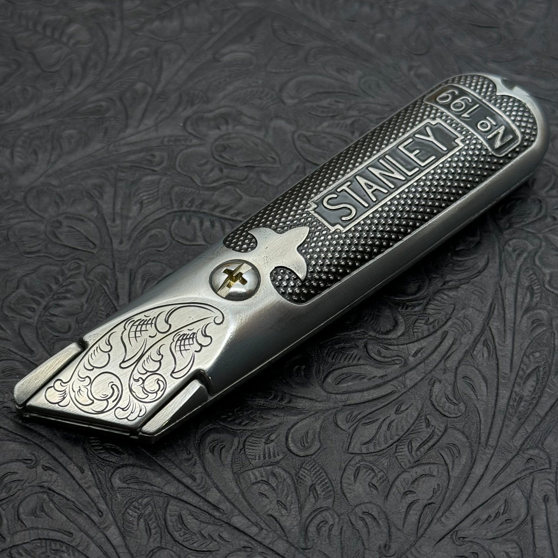 Beautiful new stock Stanley Classic 199 Utility Knife, hand engraved by The Tool Engraver (@thetoolengraver on Instagram).