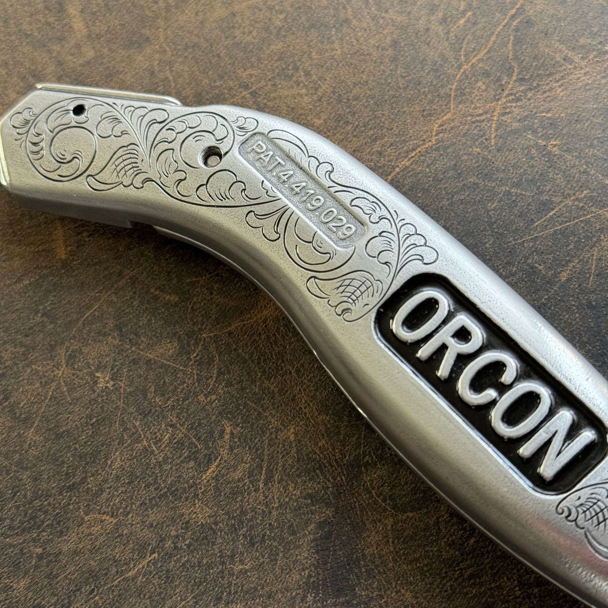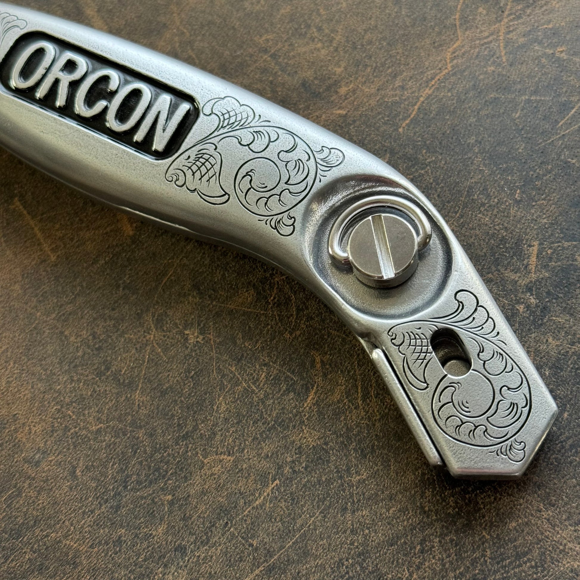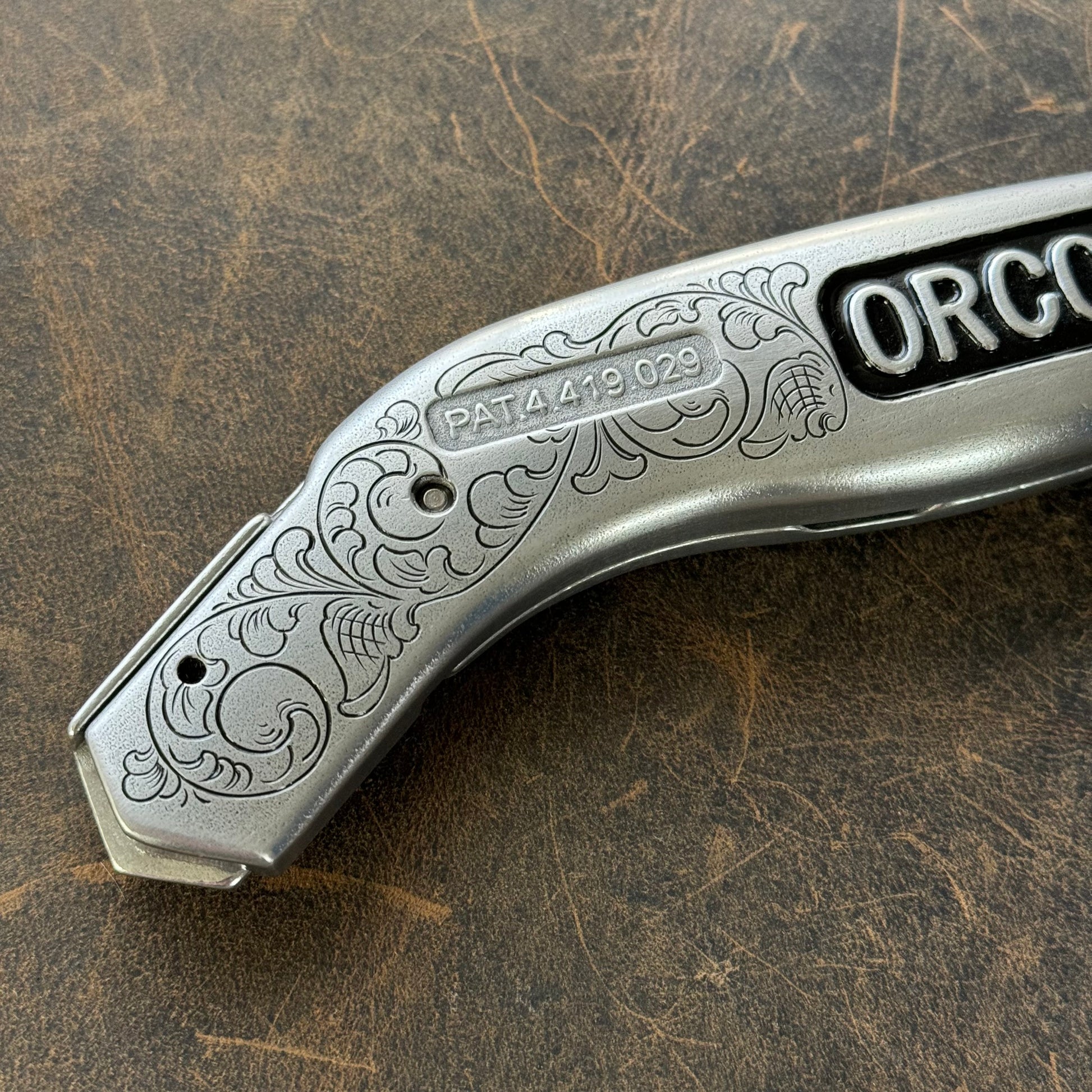 Beautiful Orcon Carpet Knife, hand engraved by The Tool Engraver.